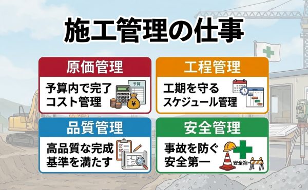施工管理とは? 施工管理は建設現場において重要な役割であり、司令塔として機能します。工程や品質の管理、スタッフの調整などを通じて円滑な施工を実現します。 何を「管理」するのか? 施工管理の仕事のうち、特に重要な4つの「管 […]